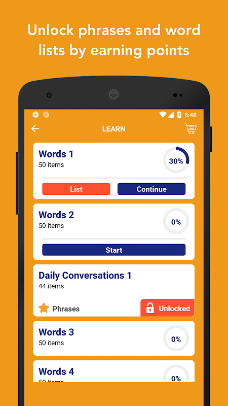 - Зарабатывайте очки, учась и практикуясь. Затем разблокируйте фразы и слова с помощью этих очков.