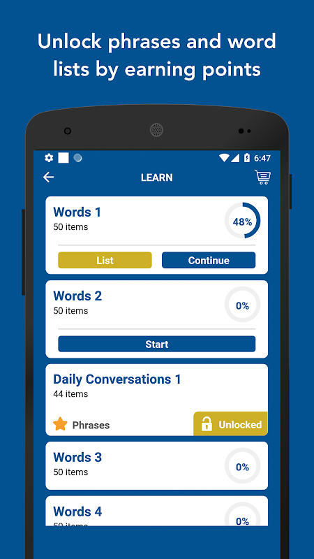 - Зарабатывайте очки, учась и практикуясь. Затем разблокируйте фразы и слова с помощью этих очков.