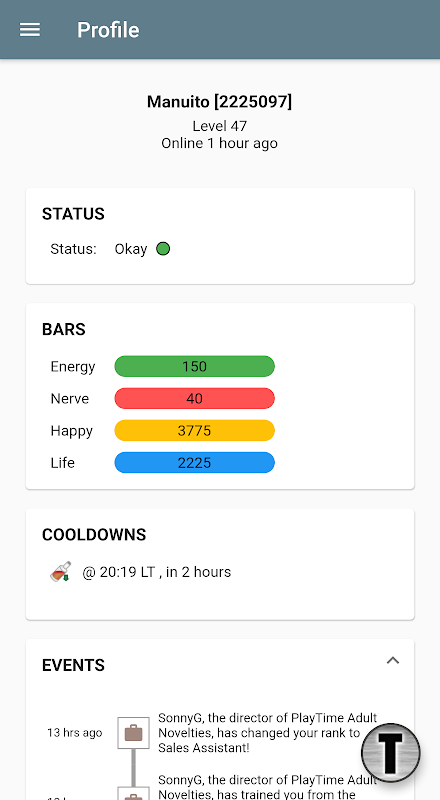 * Страница профиля с ярлыками для ваших предпочитаемых разделов, доступ к основным данным о статусе, недавним событиям, кулдаунам и расчету чистой стоимости. Вы также можете вручную активировать уведомления, чтобы не тратить энергию, нервы или не пропускать истечение кулдауна.