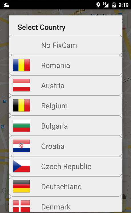 Настройка #FixCam - база данных, содержащей скорость фикса камера большинство европейских, Северная Америка и Австралия стран доступна. Пользователь выбирает страну из его местоположения и скоростей затруднительных камер вокруг его позиций отображается и обновляется во время движения.