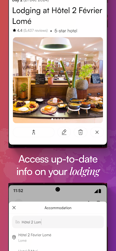 Если вы уже забронировали отель или место для ночлега, вы можете добавить его в свой маршрут, и Trip olock автоматически предоставит дополнительную информацию о нем, включая фотографии, изображения, отзывы/рейтинг и ссылку на карты Google для облегчения навигации.