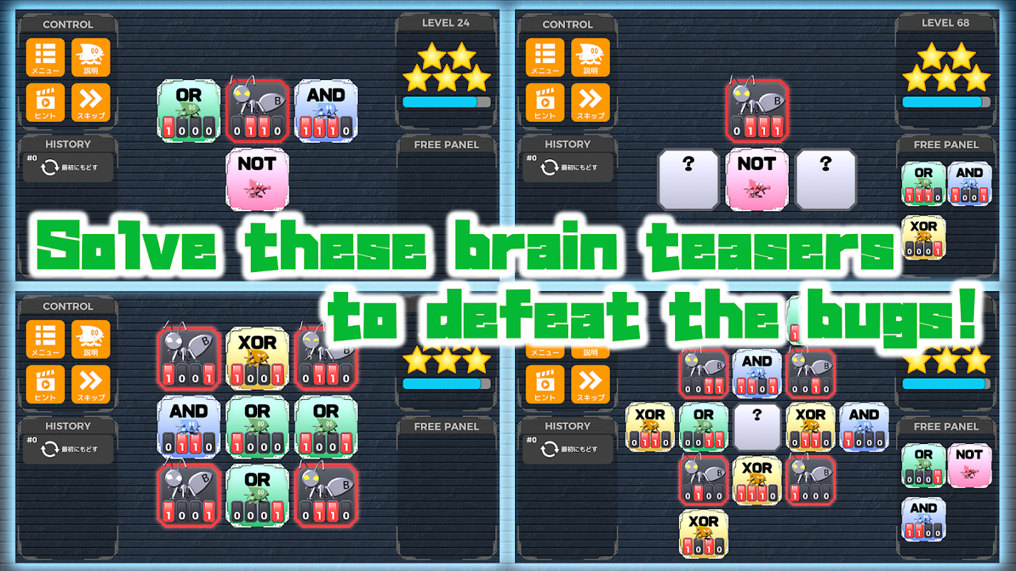 In this game, you will be using panels containing the four logical operations in order to delete the "BUG".