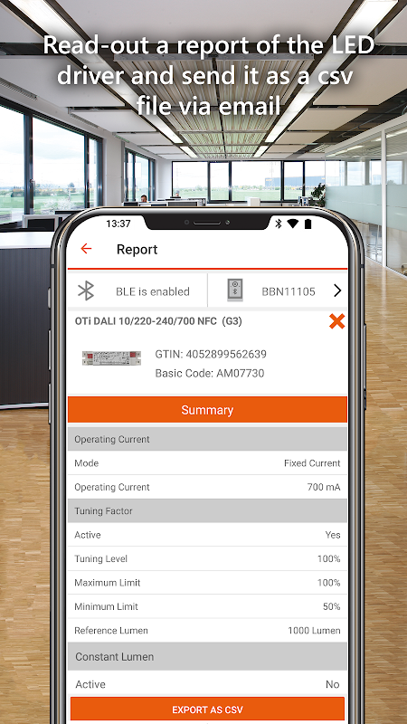 - Показать отчет о конфигурации светодиодного драйвера и отправить его по электронной почте в виде файла CSV.
