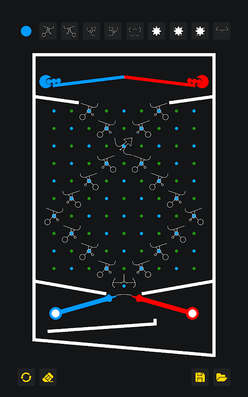 Ball drops. The standard version uses two ramps which store a given number of balls. A switch at the bottom of the board triggers the release of the initial ball (typically blue), from the top left of the panel. The second ramp, on the right, contains red balls.