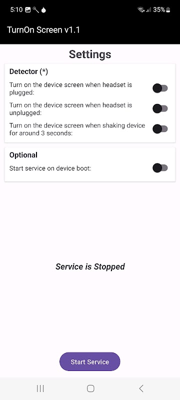 Установите и откройте это приложение на своем устройстве, на экране приложения есть несколько вариантов активации детектора. Вам следует активировать хотя бы один детектор, чтобы можно было запустить службу, нажав кнопку «Запустить/Остановить службу» в нижней части экрана приложения.