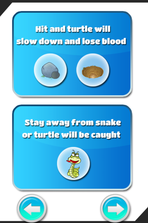 "Turtle Run" is a very simple game with the only one playing mode. You will help the little turtle avoid obstacles such as stones, holes, snakes, and especially cruel eagles while he tries to run as far as possible to the water. Let’s help him on this exciting journey, now.