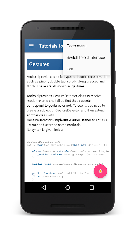 Учебники по Android для разработчиков содержат множество примеров с исходными кодами, которые упрощены и прокомментированы элементарно. Он не только содержит исходные коды, но также имеет функцию «Вопросы / Ответы на собеседование», которая помогает преодолеть сложности интервью.
