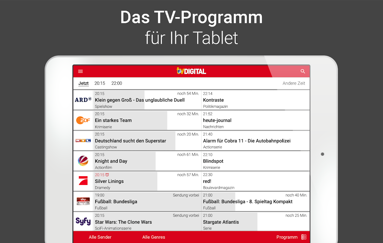 Новый TV DIGITAL App убедило простой операции и ясной и всеобъемлющей информации о программе ваших любимых телевизионных каналов - ARD и SKY Бундеслига. Использование полностью бесплатно. Все о вашем новом ТВ-приложения: