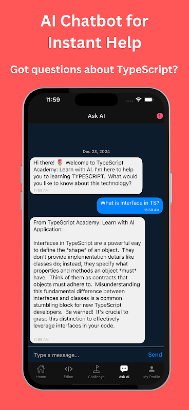 Интеграция с искусственным интеллектом. Искусственный интеллект приложения дает вам персонализированную обратную связь, помогает генерировать код и исправляет ошибки, делая обучение более быстрым и эффективным. Независимо от того, используете ли вы редактор TS или TypeScript IDE, ИИ направляет ваше обучение с помощью индивидуальных решений.