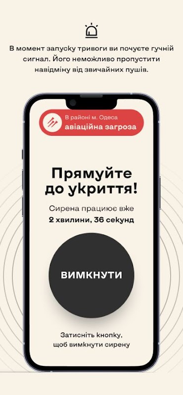 Додаток працює по принципу сирени, але на вашому телефоні. Як тiльки у мiстi спрацьовує система оповіщення - мы про це знаємо та відправляємо гучний сигнал тривоги на ваш телефон. Так, саме гучний звук сирени - не повідомлення.