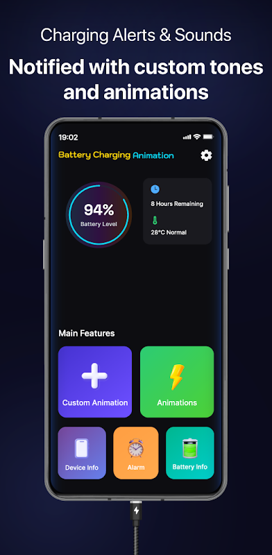 Это анимационное приложение для зарядки мобильных устройств имеет уникальные темы анимации для мобильных устройств, обеспечивающие потрясающую анимацию, отображаемую на экране блокировки, и упрощает проверку процента зарядки мобильных устройств на главном экране. Приложение-аниматор зарядки имеет множество крутых и потрясающих эффектов. В бесплатном приложении для анимации зарядки есть множество тем для анимации зарядки, доступных для экрана блокировки.