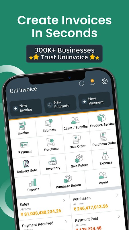 Независимо от того, управляете ли вы универсальным магазином, хозяйственным магазином, оптовой торговлей, розничной торговлей или сферой услуг, Uni Invoice упрощает выставление счетов, управление счетами, расходами и бухгалтерскими книгами клиентов, позволяя вам делать всё это с телефона.