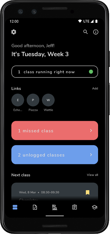 • После добавления курсов и их классов приложение автоматически показывает вам занятия, которые произошли, что позволяет вам отмечать свое посещение