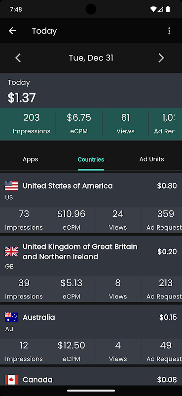 - Посмотрите, сколько вы зарабатываете: получите четкое представление о своем ежедневном, еженедельном, ежемесячном и годовом доходе от рекламы в приложении.