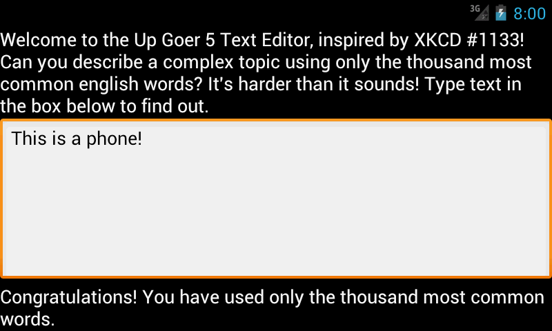 Это звонок Goer 5 текстовый редактор, вдохновленный XKCD # 1133! Можете ли вы описать сложную тему, используя только тысячу самых распространенных английских слов? Это сложнее, чем кажется!