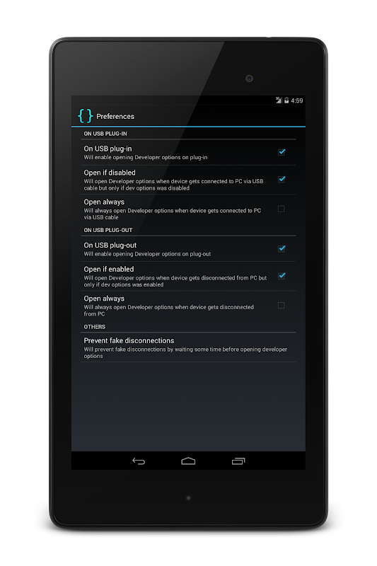 Это приложение позволяет быстро открытой опции разработчика. Стандартные шаги для открытия опций для разработчиков является Параметры -> Параметры разработчика. С помощью этого приложения, эти опции будут появляться автоматически при подключении устройства к USB или при отключении устройства. Затем вы можете выбрать, какие опции вы хотите, чтобы включить или выключить, как вы делали раньше.