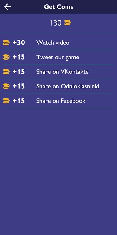 - *Зарабатывайте монеты* Вы можете зарабатывать монеты несколькими способами. Посмотрев короткое видео продолжительностью 30 секунд, поделитесь нашим приложением в социальных сетях или отправьте ссылку на приложение одному из ваших друзей. Или зарабатывайте монеты за правильное прохождение уровней.