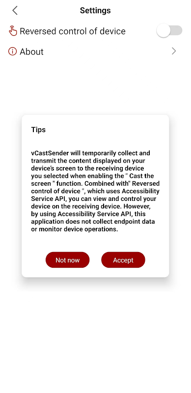 ● При нажатии переключателя для включения функции «Обратное управление устройством» появится сообщение «Советы». Прочтите сообщение и нажмите кнопку «Принять», если вы согласны разрешить службе доступности vCastSender полный контроль над вашим устройством.