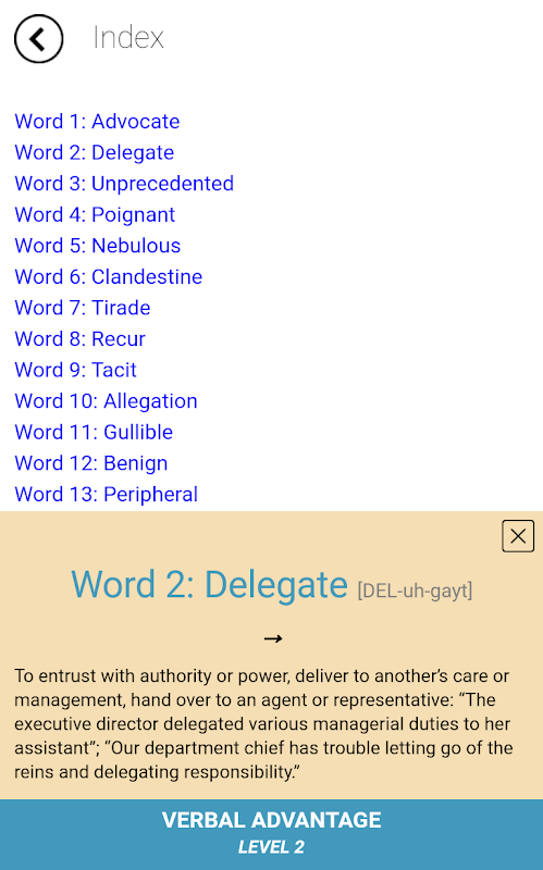 Вы переходите через десять уровней лексики, каждый уровень более сложный, чем в прошлом. Например, уровень 1 содержит слово, знакомое примерно от 60 до 70 процентов взрослого населения, то есть слова, известных многих выпускники средней школы и большинство выпускников вузов. К концу 5-го уровня вы подняли свой словарный запас до 75-й процентиль-верхней четверти всех образованных взрослых. К концу уровня 8 ваш словарный запас будет превзошел большинство руководителей и специалистов, в то числе с учеными степенями. И когда вы закончите десятый и последний уровень вы продвинулись за 95 процентов от всего населения. Вы будете командовать арсенал слов, только горстка людей в каждых тысячи может соответствовать.