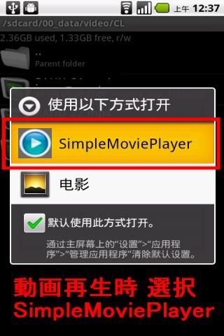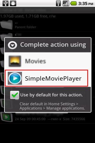 Android будет спросить, если вы хотите играть в видео с помощью "Очень простого фильма Player", "Видео" или другой видео приложение. Отметьте "Установить как по умолчанию приложение" флажок затем выберите "Очень простого фильма Player".