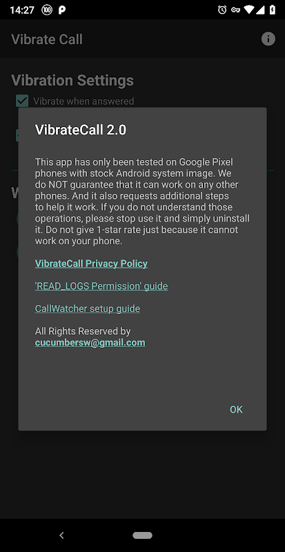 Пожалуйста, прочтите руководство по разрешениям https://sites.google.com/view/cucumbersw/vibratecall-permission-guide и руководство по установке сопутствующего приложения https://sites.google.com/view/cucumbersw/outgoing-call-watcher перед тем, как Вы решили установить это приложение.