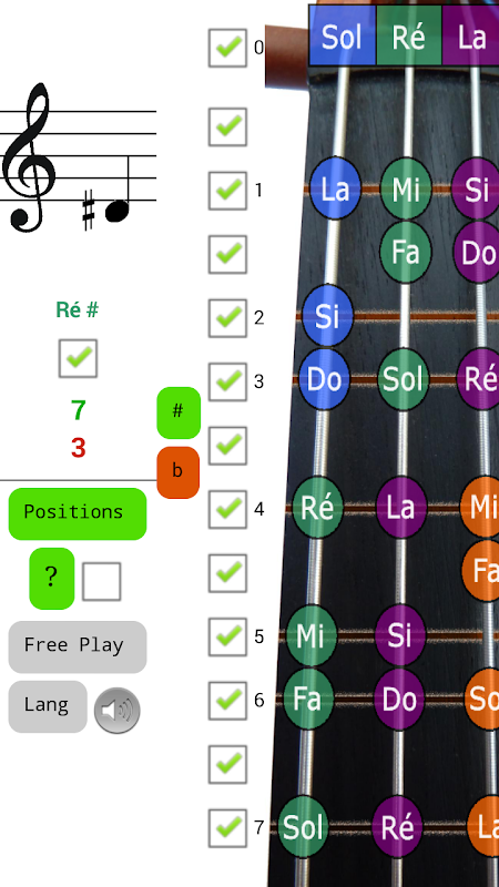 - Choice of notes to play : Choice of positions among 13 possible ones (from open string to 7th position), flat On/Off, sharp On/Off