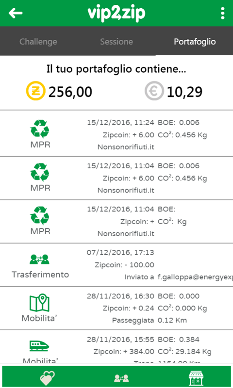 Inizia a misurare i tuoi comportamenti green e a guadagnare ZIPCOIN, con l'app vip2zip raggiungerai senza fatica gli obiettivi di riduzione di impatto richiesti dalla COP21 di Parigi, senza sacrifici anzi... guadagnando ZIPCOIN.