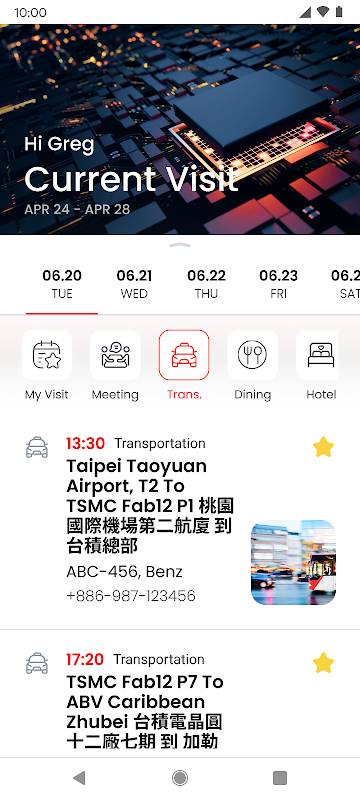Предоставьте сводную информацию о вашем посещении TSMC, помогите вам управлять своим расписанием во время пребывания в TSMC и предоставьте всю необходимую вспомогательную информацию.
