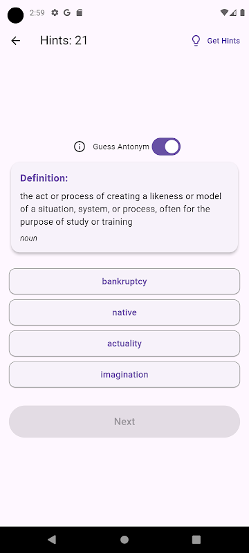 Режим викторины: проверьте свой словарный запас с помощью забавных вопросов с несколькими вариантами ответов.