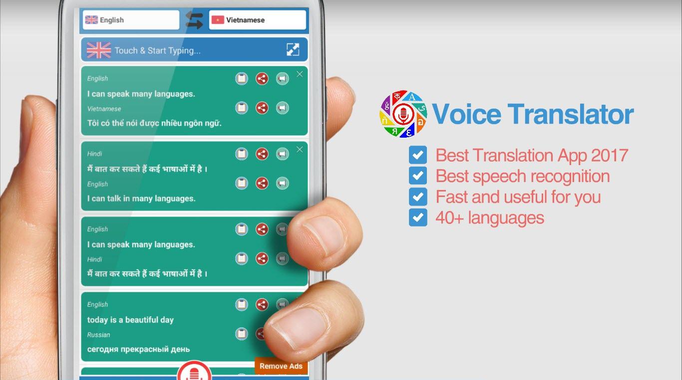Это небольшой инструмент, простой в использовании, чтобы помочь вам перевести свой собственный голос, а затем зачитывают результаты переводить как реальный переводчик. не позволяет вам путешествовать, социальное взаимодействие уже не является языковой барьер. Voice Translator Free также одноклассник и удобные языковые средства будут поддерживать ваше обучение и работу. Перевод будет сохранен на вашем компьютере, так что вы можете посмотреть позже. Кроме того, камера OCR является инструментом, который будет очень полезен, когда у вас есть проблемы с длинным абзацем или языком, который вы не можете ввести (например, японские, китайские, ...), просто стрелять и Free Voice Translator поможет вам перевести.