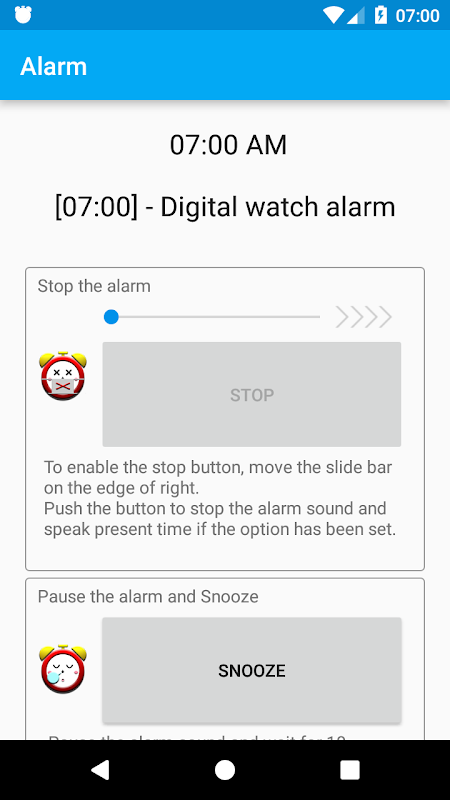 Вы можете сделать настройки будильника. Приложение будет говорить указанный голос в заданное время с помощью настроек сигнализации. Голос сигнализация продолжает играть, пока вы не остановите его. Приложение имеет функцию повтора и замирания в функцию.