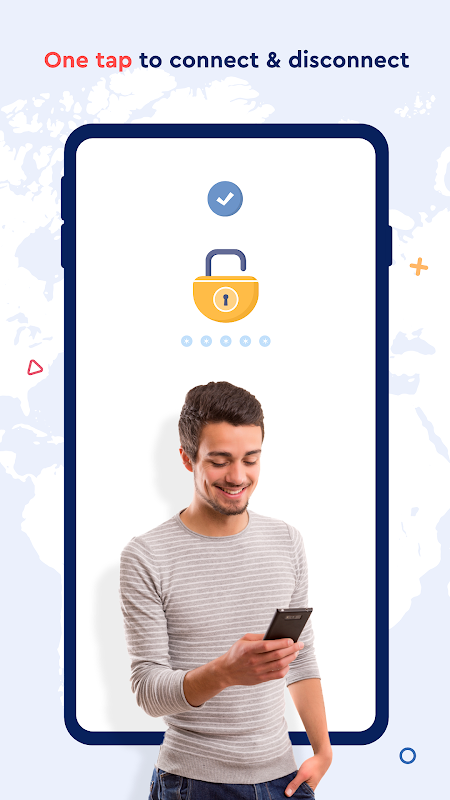 Мгновенно с помощью одной кнопки подключитесь к безопасному бесплатному VPN-серверу и не беспокойтесь.