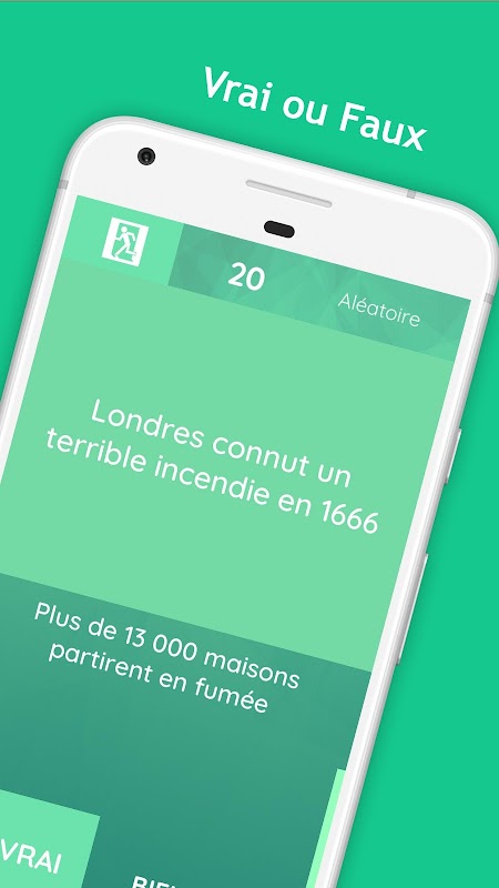 Cette application gratuite va vous permettre de développer votre culture générale et tester votre matière grise ! Cultivez-vous de façon ludique grâce aux centaines de questions incluses gratuitement dans l'application sous forme de vrai ou faux.