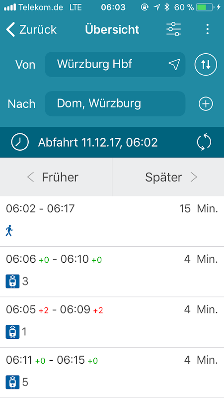 полезный спутник в общественном транспорте в целом Франкония. В дополнении к двери до двери соединений, информация о мобильном расписании на трамвай, автобус и поезд около вылета и прилета из местоположения пользователя, остановки или с картографической информации. Для многих транспорта здесь данных в режиме реального времени, такие как задержки и отмены доступны. Кроме того, позиция транспортировки на карте может быть соблюдена. Избранные позволяют легко находить информацию путешествия для часто используемых соединений. Вся цепь путешествия можно проследить на карте или аэрофотосъемках, в том числе пешеходных дорожек. основные линии сеть в «Area Networks» композит также извлекаемая.