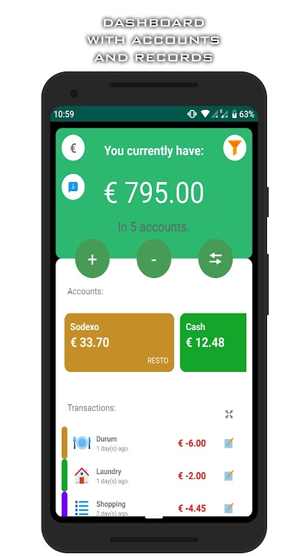 Зарегистрируйте ваши наличные, дебетовые, Visa и просто отслеживать свои расходы. Прост в использовании!