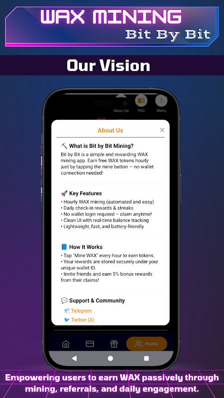 Откройте для себя простой и увлекательный способ зарабатывать токены WAX прямо со своего телефона. С Bit by Bit Mining вы можете майнить WAX каждый час и получать бесплатные ежедневные награды — не требуется специального оборудования или инвестиций!