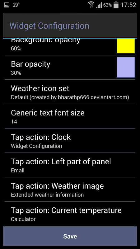 - богатые настройки кастомизации позволяют адаптировать виджеты к практически любому фону вашего рабочего стола. Изменяются: все цвета, прозрачность фона и полосы, шрифт, размер шрифта, набор иконок, тень шрифта и другое.