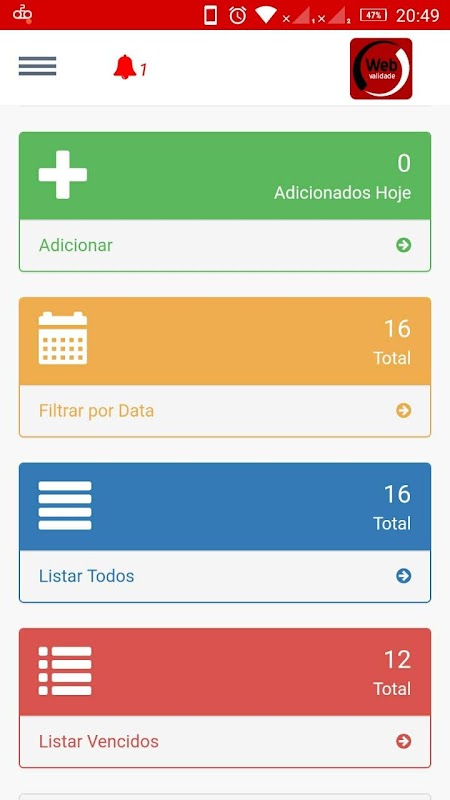 Web Validade имеет базу данных с более чем 13 000 зарегистрированных продуктов, просто отсканируйте штрих-код продукта и, если есть регистрация, она появляется в форме, просто введя действительность и сохраните. Если продукт не существует, зарегистрируйтесь только один раз, и в следующих записях при сканировании или вводе штрих-кода он появится в регистрационной форме. И чтобы сделать его более удобным, веб-приложение Validade имеет быстрые экраны запросов, такие как проверка всех элементов, которые уже выиграли или истекают в соответствии с временем или параметрами запроса между датами. Создавайте отчеты и делитесь ими с вашей командой или людьми, участвующими в борьбе с потерями вашей компании.