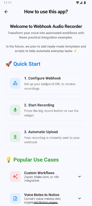 Webhook Audio Recorder — это мощное и лёгкое приложение для разработчиков, предпринимателей, подкастеров, журналистов и специалистов по построению рабочих процессов, которые хотят автоматизировать голосовые команды, транскрибацию и безопасную загрузку аудио.