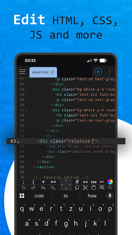 Благодаря мощному редактору кода, предварительному просмотру веб-сайтов в реальном времени, Git, FTP/SFTP, SSH и встроенным руководствам, он предоставляет вам все необходимое для разработки, отладки и развертывания — прямо с вашего телефона или планшета.