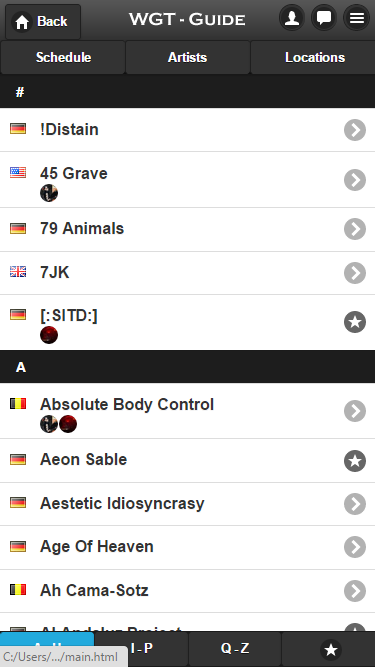 Помимо полного расписания WGT, в приложении есть список всех участвующих артистов, включая дополнительную информацию. Добавляя исполнителей и события в избранное, WGT-Guide позволяет вам создать свое личное расписание WGT.