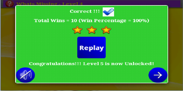 «Что не хватает» - это простой и увлекательный способ выучить последовательность чисел и алфавита. Игрок переходит на следующий уровень, выполнив минимальное количество правильных игр. После каждой игры игроку показывается статистика уровня, такая как количество побед и процент выигрышей. Это побуждает игрока продолжать стремиться к более высоким достижениям.