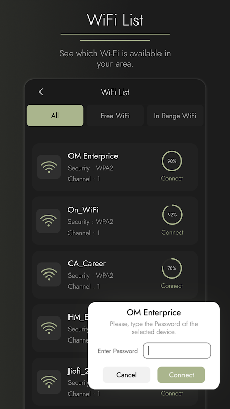 В списке Wi-Fi вы можете просмотреть список доступных Wi-Fi рядом с вами. Здесь вы увидите доступное имя Wi-Fi, безопасность, канал и скорость.