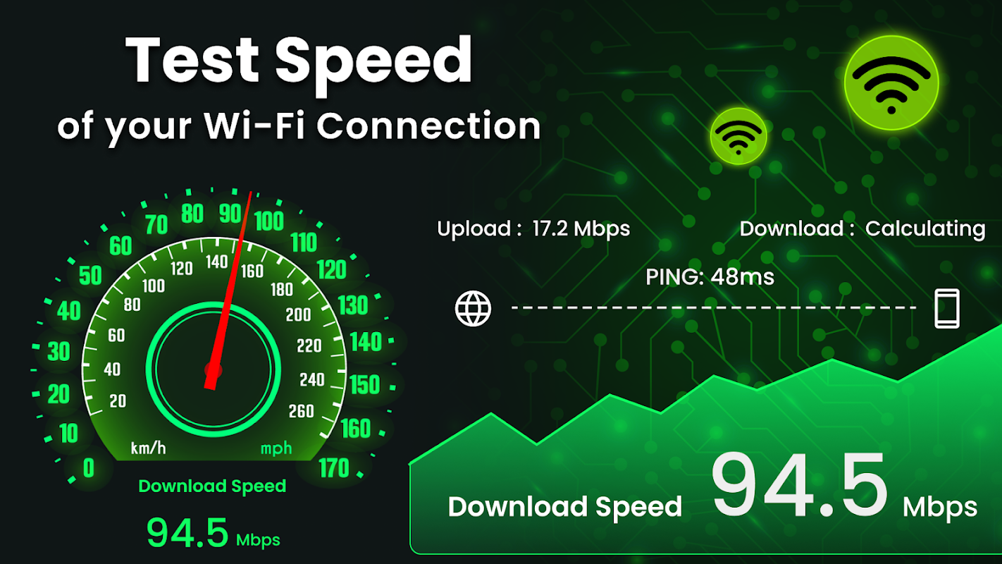 Тестер скорости Wi-Fi и уровень сигнала проверяют скорость загрузки и скорость загрузки подключенной сети Wi-Fi. Легко отслеживайте скорость загрузки и выгрузки по беспроводной сети одним касанием.