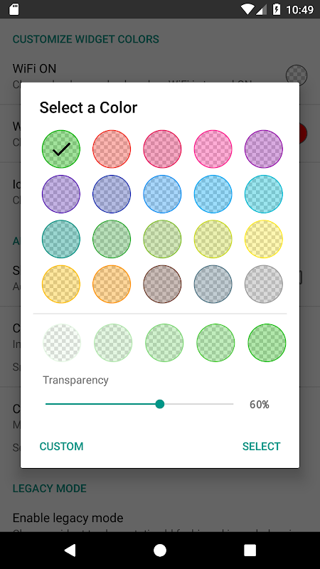 This app provides you with an essential WiFi toggle widget you can use to manage your WiFi Connection state directly on your phone desktop. Choose the color, shape, transparency and size you like the most and associate them with WiFi ON and OFF states!!