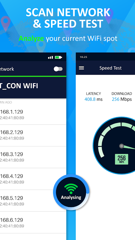 Функция проверки скорости Wi-Fi и анализатора Wi-Fi проанализирует и оптимизирует ваши сети Wi-Fi. Вы можете проверить уровень сигнала и найти лучшее место, где не обнаружены помехи. Это приложение также покажет точную скорость загрузки и скачивания данных по Wi-Fi.