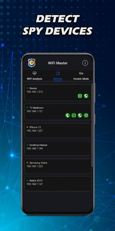 Откройте для себя и защитите безопасность своих сетей Wi-Fi, где бы вы ни находились: дома, в путешествии или в новом месте. WiFi Master предназначен для того, чтобы помочь вам оценить безопасность незнакомых сетей, таких как отели, пункты аренды или другие места общего пользования, и обнаружить любые скрытые или подозрительные устройства.