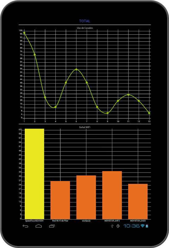 Выберите сеть WIFI и покажет перекрытие всех каналов. Выберите канал с меньшим перекрытием за лучшее исполнение на вашем WIFI сети.