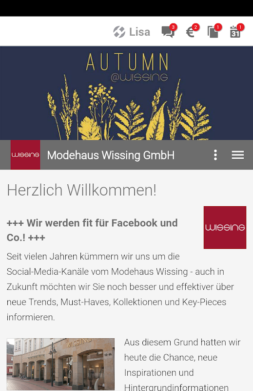 Wissing - starke Mode - starke Marken. Dein Modehaus in Steinfurt-Borghorst und Emsdetten. Und mit der Wissing App bist Du immer informiert. Alle Neuigkeiten, Veranstaltungen, Bilder, Angebote und Aktionen landen direkt in Deiner Hosentasche.