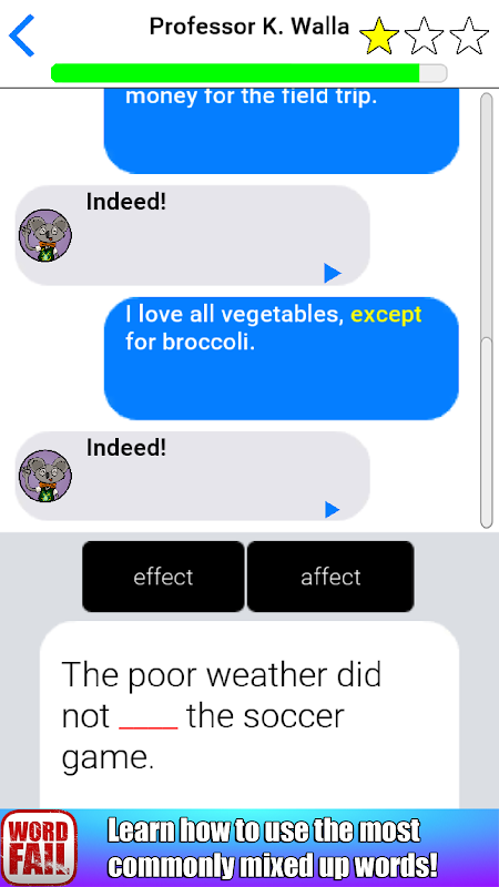 "WordFail" is an educational game designed to help you learn the proper usage of the most commonly misused words in English. These are mistakes that even native English speakers make! Think you're an English-language master? What if we only gave you a few seconds to choose the right answer? Now it becomes a game even college English professors will find challenging!